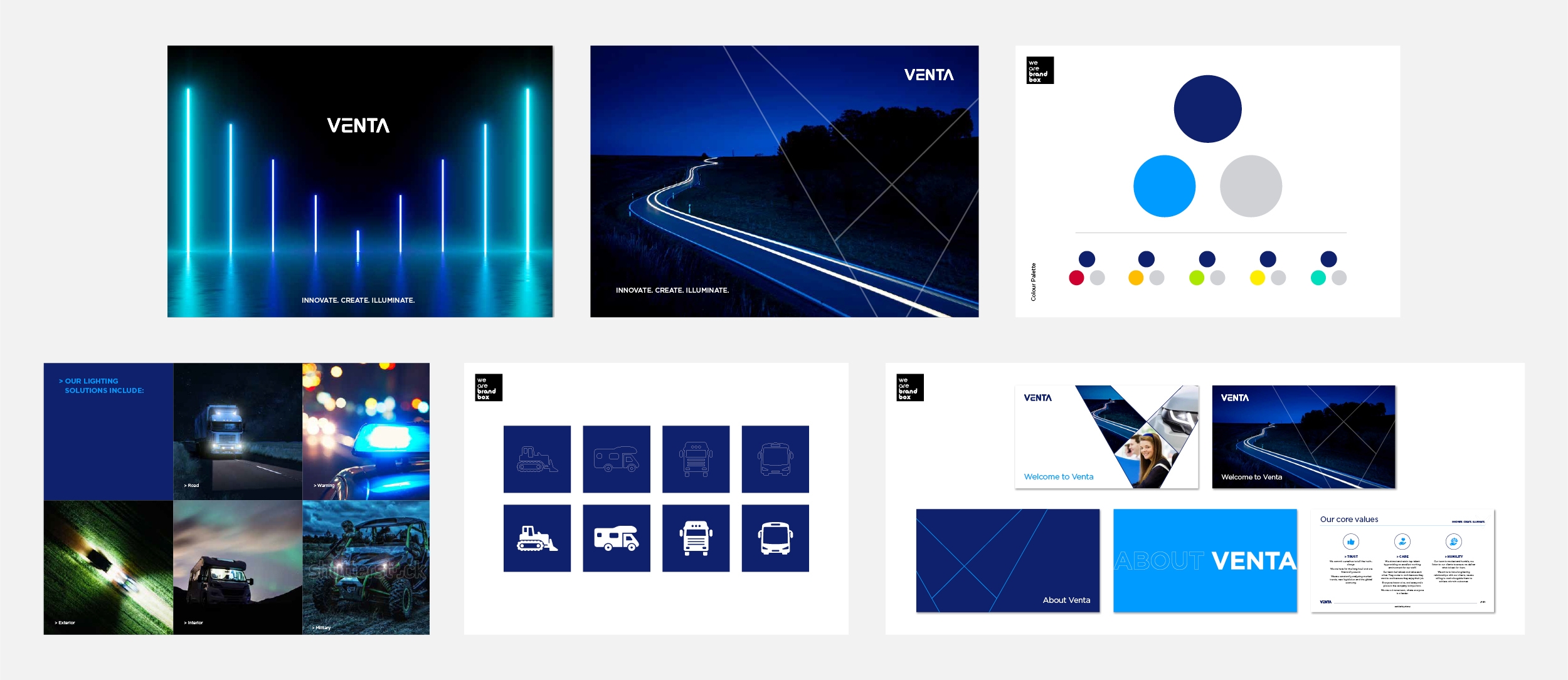 A refined version of the current logo, accompanied with more dynamic imagery, always showing the lights in use. The light to dark gradient represents Venta’s vision into the future.